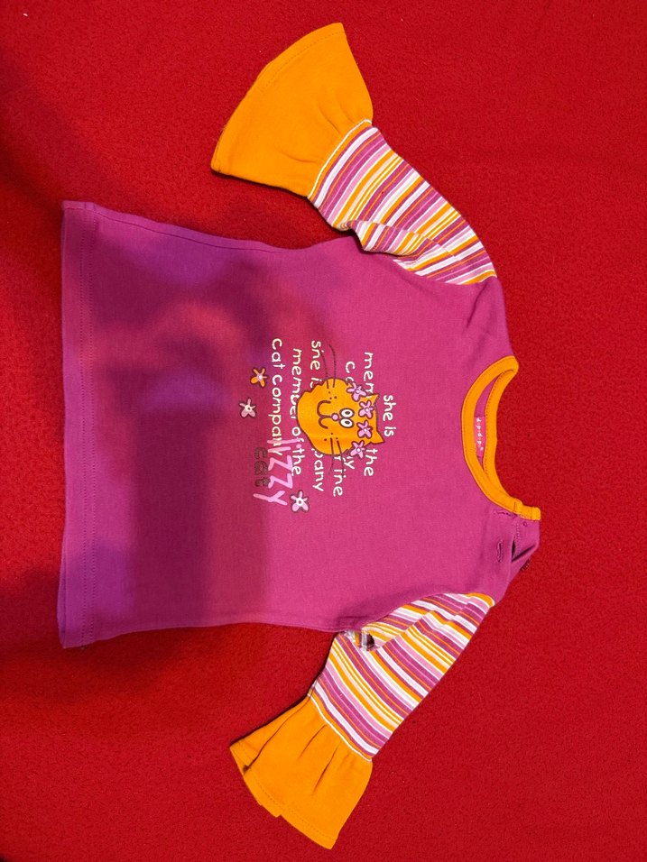 6-9 ay. İspanyol kollu. Rahat kesimli, uzun kollu kız tişörtü, canlı baskılı kedi motifi ve çizgili kollarıyla yumuşak ve sıcak kumaştan üretilmiştir. Yuvarlak yaka içerir.