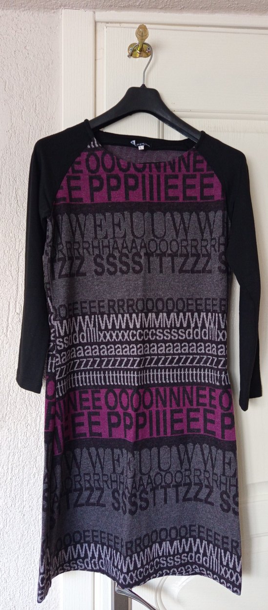 Midi boy, uzun kollu ve yuvarlak yaka triko elbise, koyu mor ve siyah baskılı dokuma kumaştan. Rahat kesimi ve gotik tarzıyla dikkat çekiyor.