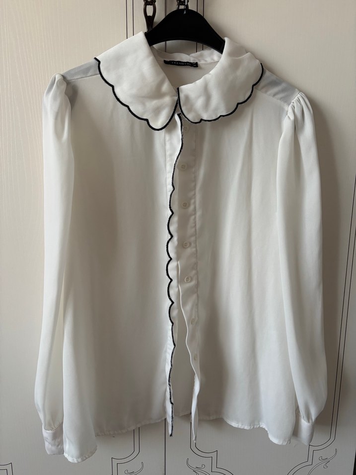 Beyaz, uzun kollu, bebe yakalı kadın gömleği. Bi kaç kere giydim . Biraz geniş dursun diyorsanız m bedenlerde tercih edebilir