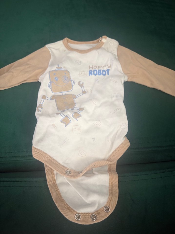 Uzun kollu, yuvarlak yaka ve düğmeli bebek body. Pastel kahverengi tonlarında, robot baskılı yumuşak pamuk kumaştan yapılmıştır.