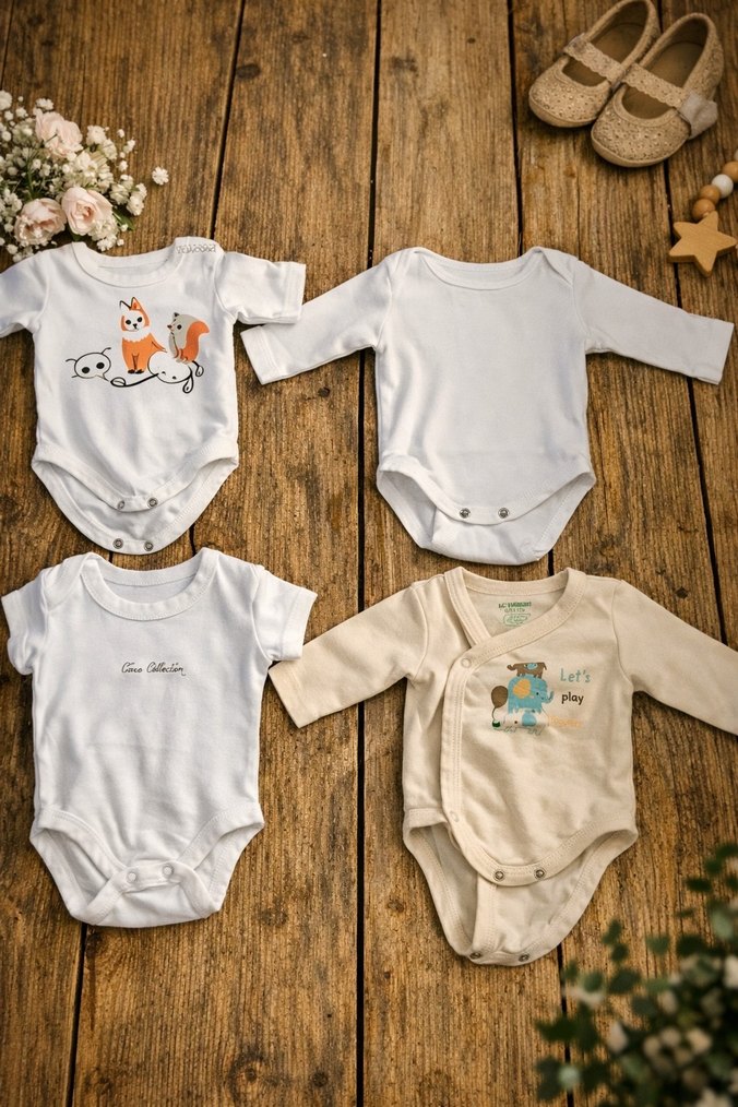 Yumuşak pastel renklerde, baskılı uzun kollu bebek bodyleri seti. Kolay çıtçıt kapama ve rahat kesim sunar. 4 adet