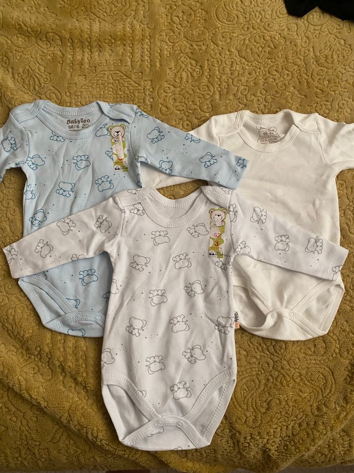 Yumuşak pamuktan uzun kollu bebek body seti, yuvarlak yaka ve düğmeli. Beyaz ve pastel tonlarda, hafif ayı desenli modeller içerir.