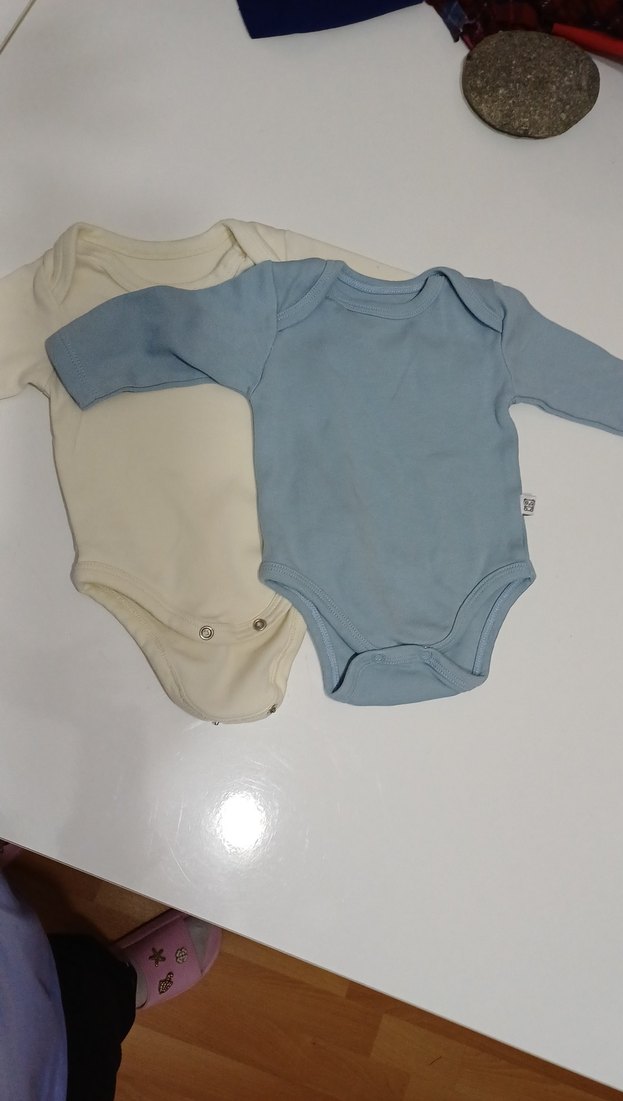 Bebekler için uzun kollu, pamuklu ve yuvarlak yakalı iki body. Pastel beyaz ve mavi renklerde, sade ve rahat tasarım.