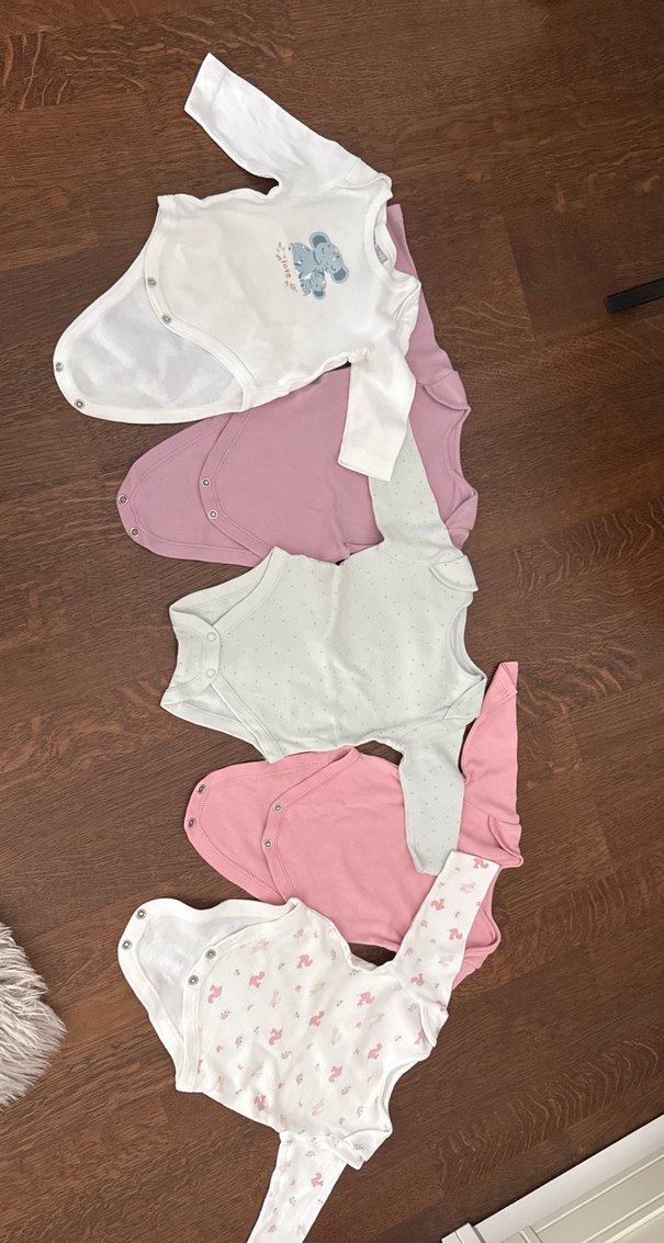 Pastel tonlarda, uzun kollu, yuvarlak yaka bebek kız body seti. Yumuşak pembe ve beyaz renkler içerir.