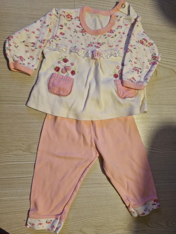 Uzun kollu, dantelli ve nakışlı bebek kız takımı. Pastel pembe tonlarında, küçük cepli ve yumuşak kumaşlı pantolonla tamamlanmıştır.yeni doğandan 3 aya kadar kullanima uygundur.