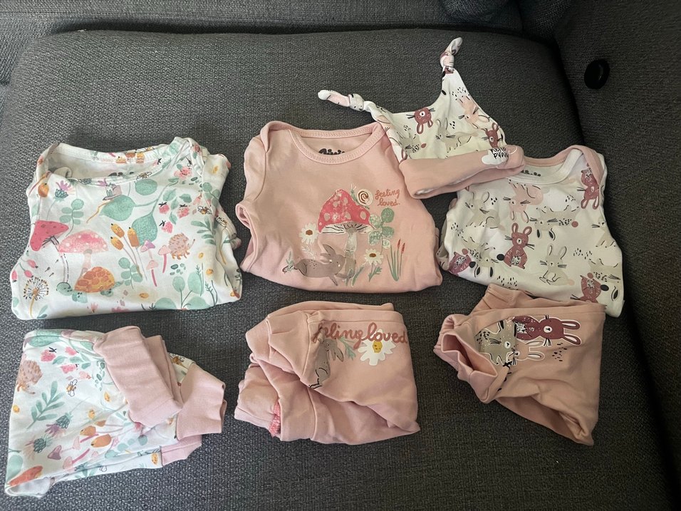 Pastel pembe renkli, uzun kollu bebek kız takımı. Doğa ve hayvan desenleri baskılı, yumuşak ve rahat kumaş.
