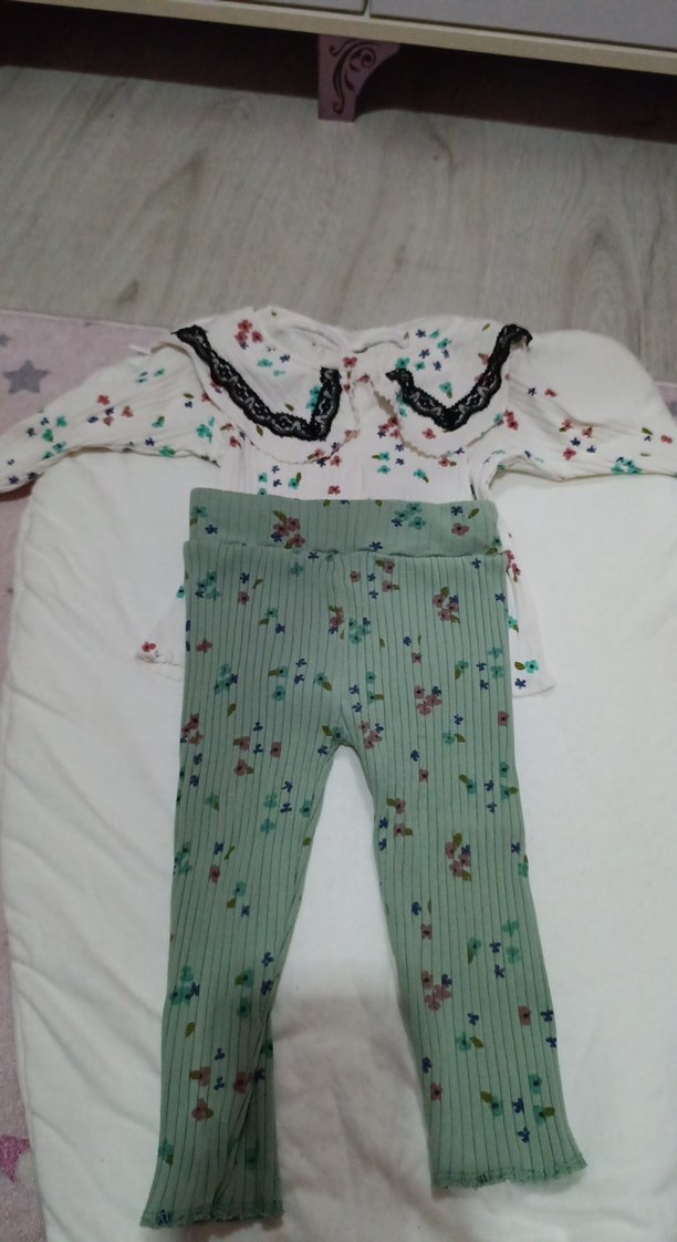 Uzun kollu dantel detaylı üst ve çiçek desenli, yumuşak renklerde tayt içeren bebek kız takımı.