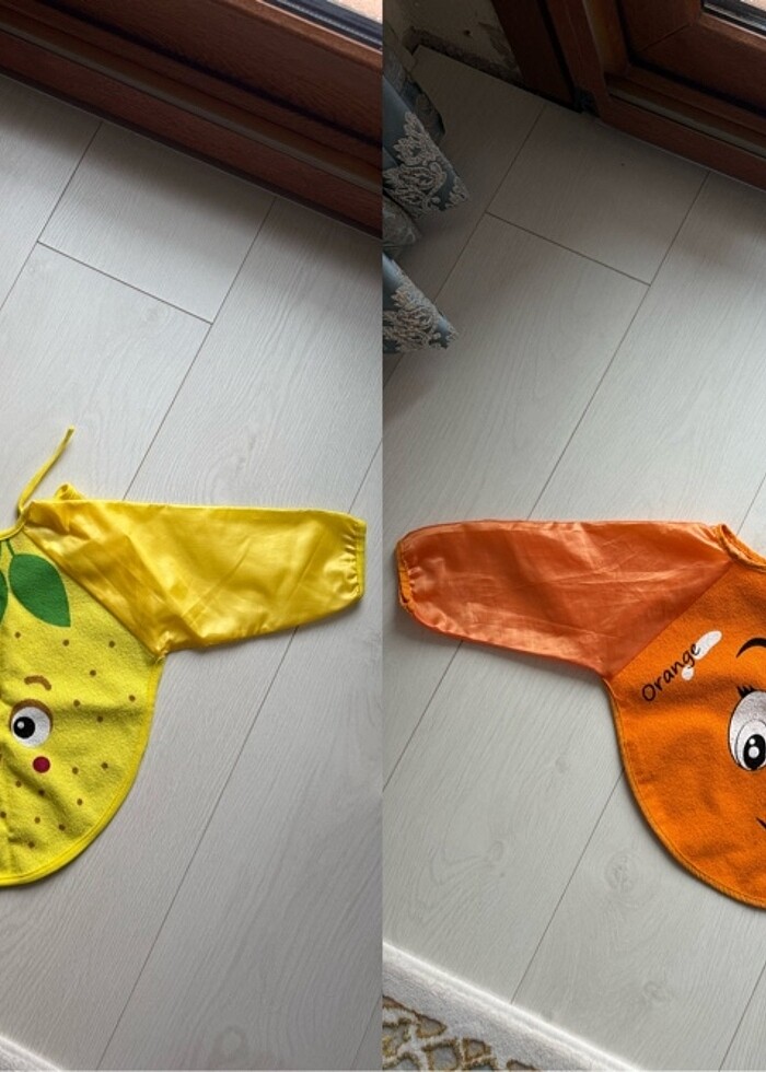 2 adet sarı ve turuncu renkte uzun kollu bebek önlüğü. 3 yaşa kadar kullanımı uygundur. İkisi de hiç kullanılmadı ama makineye atıp yıkadım. Sıfır ürünlerdir hiçbir sıkıntı yoktur.