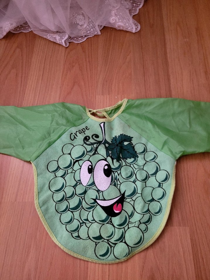 Renkli baskılı, uzun kollu ve üzüm desenli yeşil bebek önlüğü, yemek sırasında tam koruma sağlar.