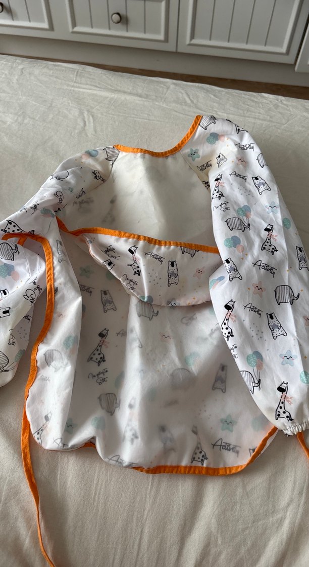 Uzun kollu, baskılı beyaz bebek önlüğü, gri ve pastel tonlarla süslenmiş, turuncu kenarlıklıdır ve tam koruma sağlar.