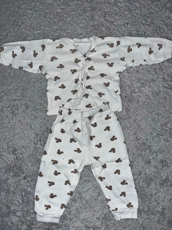 Uzun kollu, düğmeli ve V yakalı bebek takımı, yumuşak ve sıcak kumaştan, beyaz zemin üzerine gri Mickey Mouse desenlidir.