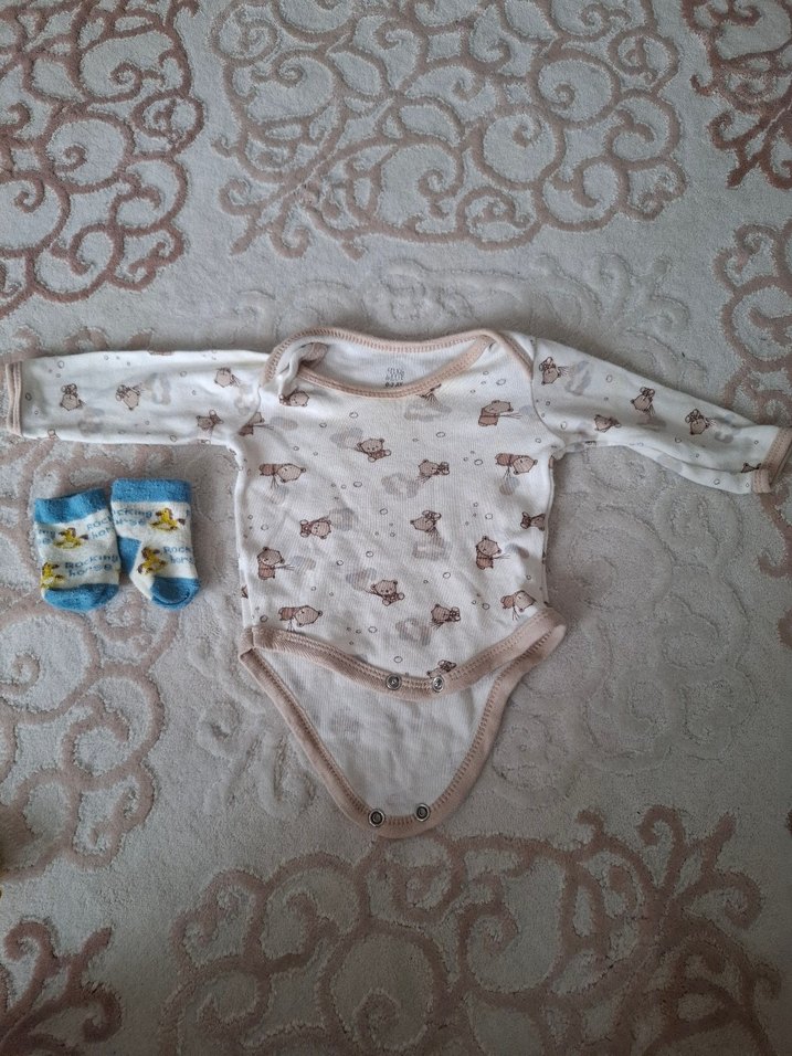 Beyaz renkte, uzun kollu ve yuvarlak yakalı triko bebek body. Pastel tonlarda küçük ayıcık desenleriyle süslenmiştir.