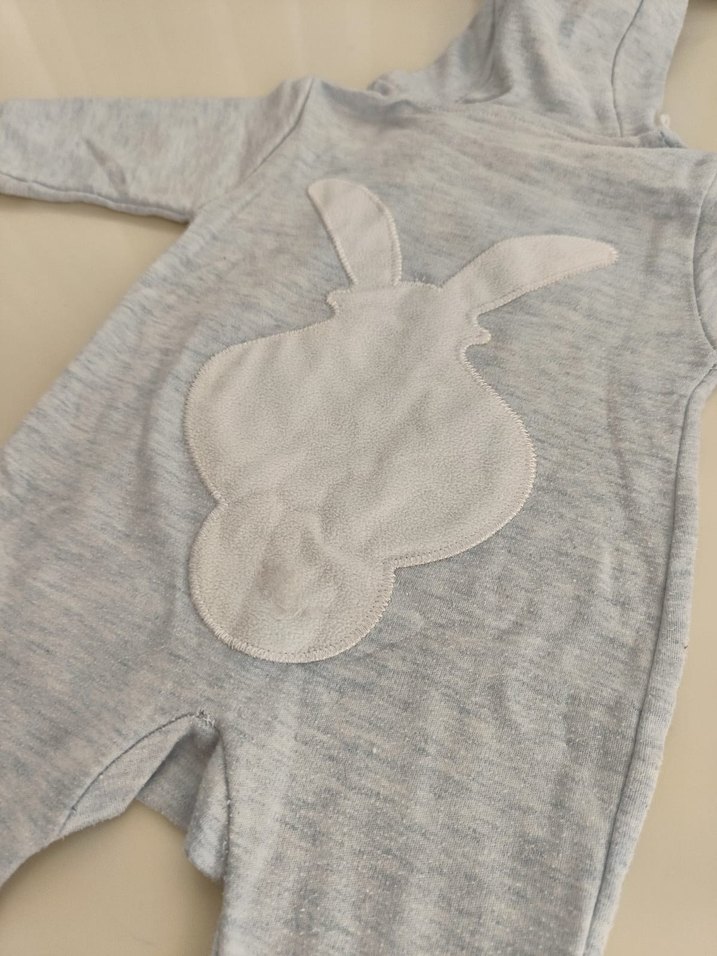 uzun kollu ve bisiklet yaka bebek tulumu. Yumuşak ve sıcak kumaştan, örme dokulu ve önünde tavşan figürü bulunur. gri renk gibi çıkmış ama bebe mavisi rengindedir.az kullanılmış ve hatasızdır