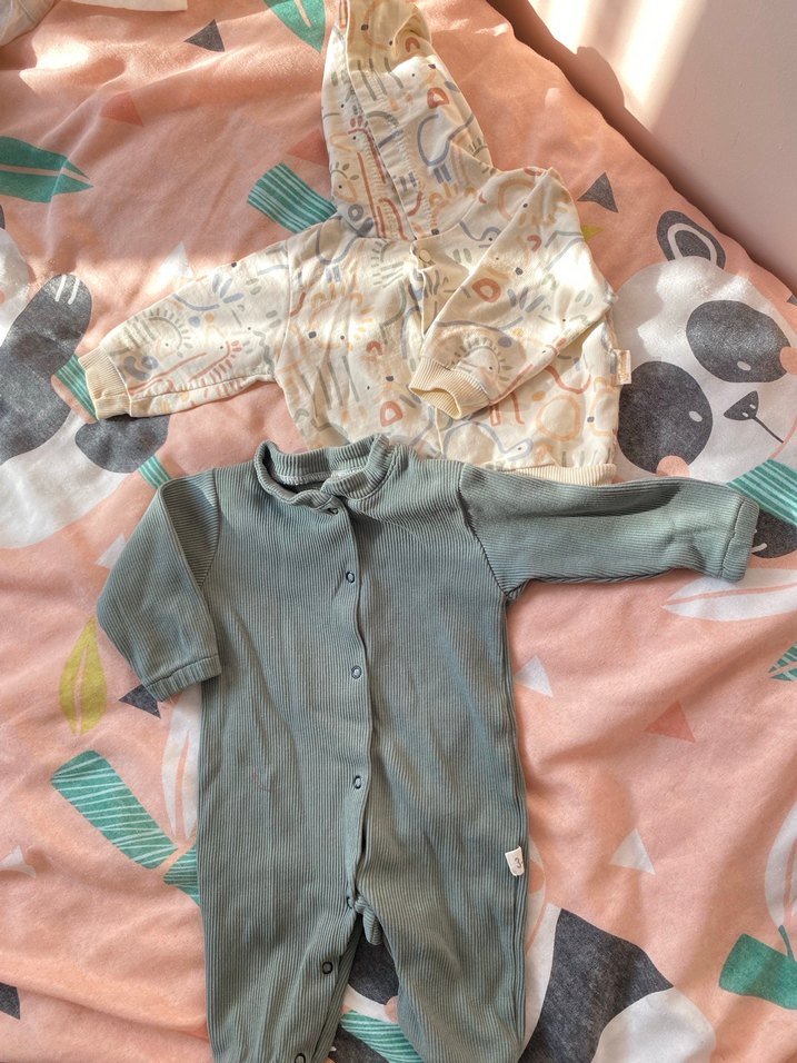 Yumuşak keten kumaştan yapılmış bebek tulumu, uzun kollu, yüksek yakalı ve düğmeli