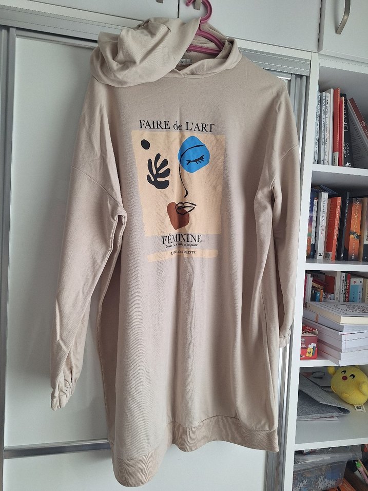 Uzun boy, bol kesim ve 'FAIRELART FEMININE' baskılı, yuvarlak yakalı, yumuşak sentetik kumaştan yapılmış bej kadın sweatshirt. Sokak modasına uygun. ️