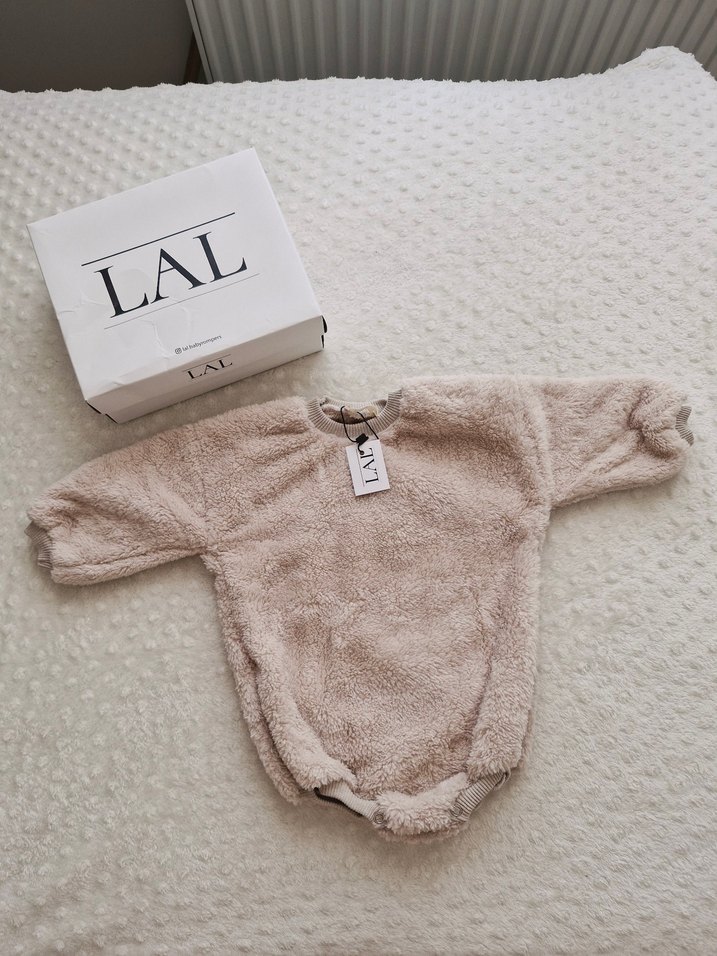 Uzun kollu, crew neck bej renkli bebek tulumu, yumuşak kumaş ve dantel detaylara sahiptir. Düz ve pastel tonlardadır. Marka: LAL.