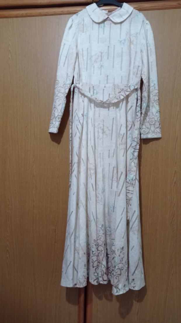 Bu uzun bej elbise, bol kesim ve drapeli tasarıma sahip, batik desenlidir. Yumuşak sentetik kumaştan yapılmış, uzun kollu ve kayık yaka ile vintage bohem tarzını yansıtır. Düğünler için uygundur.