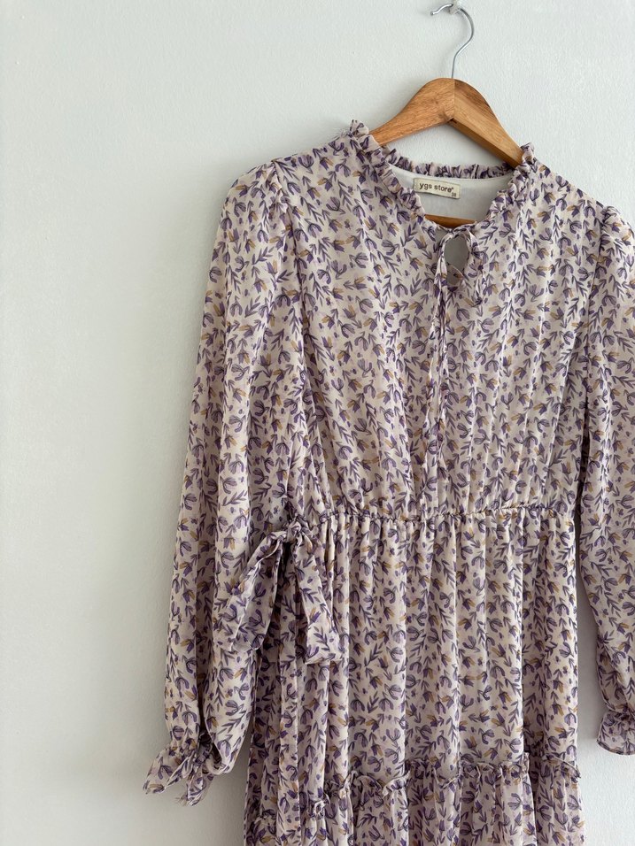 Uzun kollu, V yakalı, fırfırlı ve bol kesim bej bohem elbise, sentetik kumaştan yapılmıştır ve pastel tonlarda batik desenlidir. Boy : 128 cm