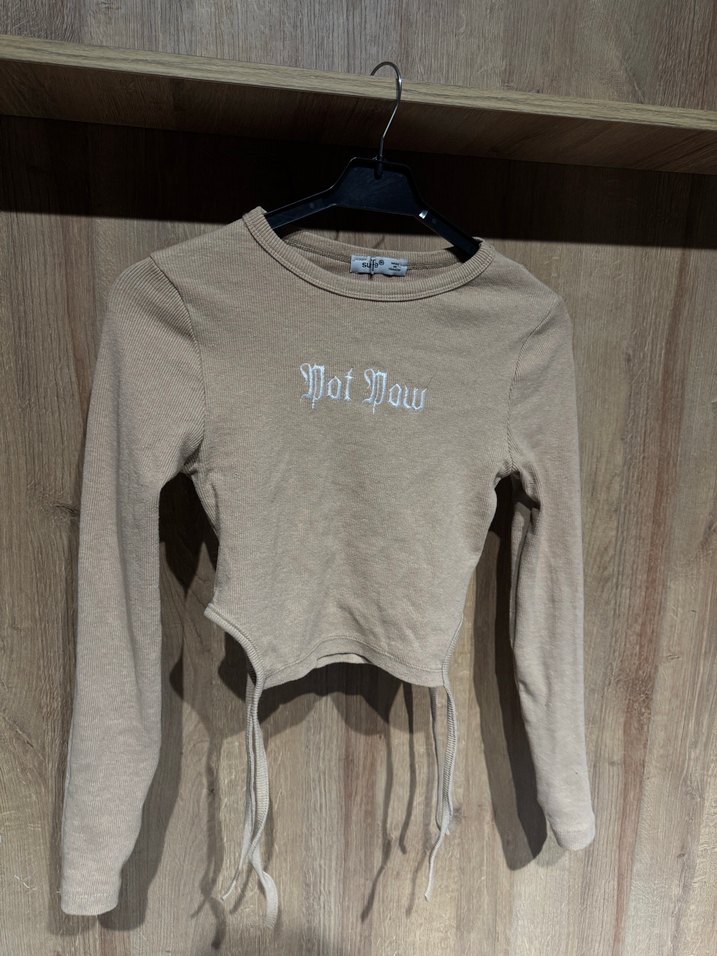 Bej renkli, uzun kollu ve bisiklet yaka crop top. Örme keten kumaştan, gri baskılı ve vücuda oturan kesime sahip. Midi boyda ve ip detaylı, günlük kullanım için uygun.