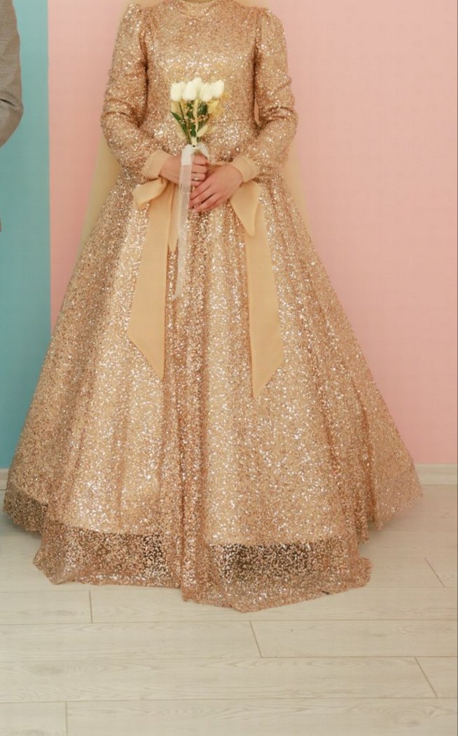 Uzun kollu, yüksek yakalı ve drapeli detaylara sahip bej renkli, desenli ve vücuda oturan abiye elbise. Düğünler için zarif ve gösterişli bir seçim.