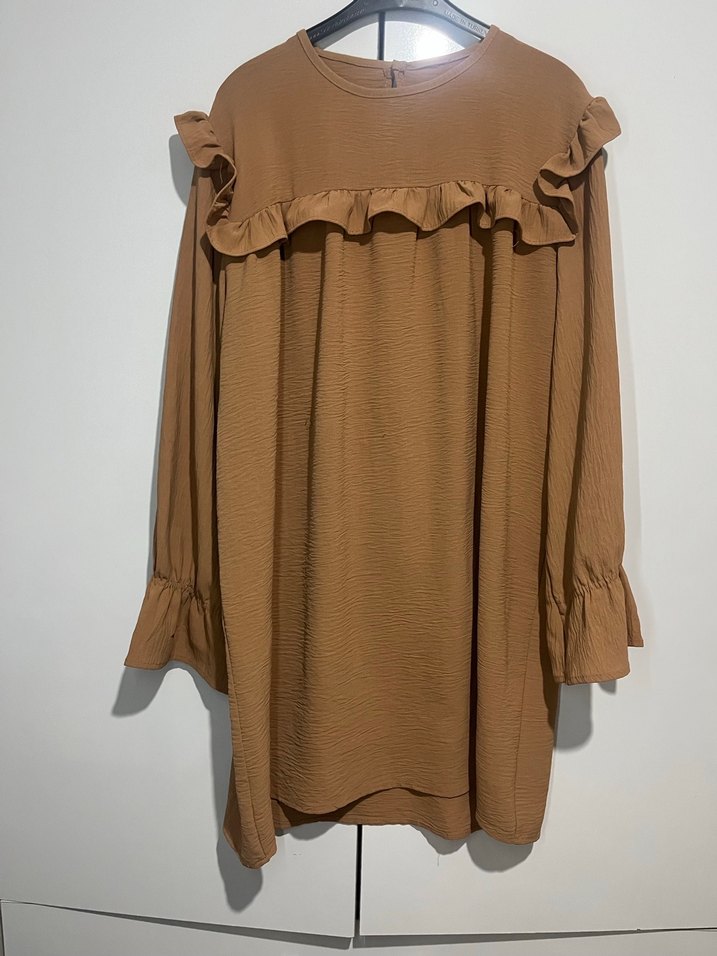 Bej keten kumaştan, uzun kollu ve yuvarlak yaka tunik. Göğüs ve manşetlerde fırfır detayları vardır. Bol kesim ve uzun boydur, bohem tarzı yansıtır. Ufak bir çekilmesi mevcut