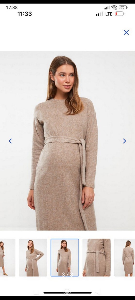 Bej renkli, uzun kollu, yuvarlak yakalı, triko yün kumaştan yapılmış, beli kuşaklı, uzun kesim hamile elbisesi. Rahat ve şık günlük kullanım için uygundur.
