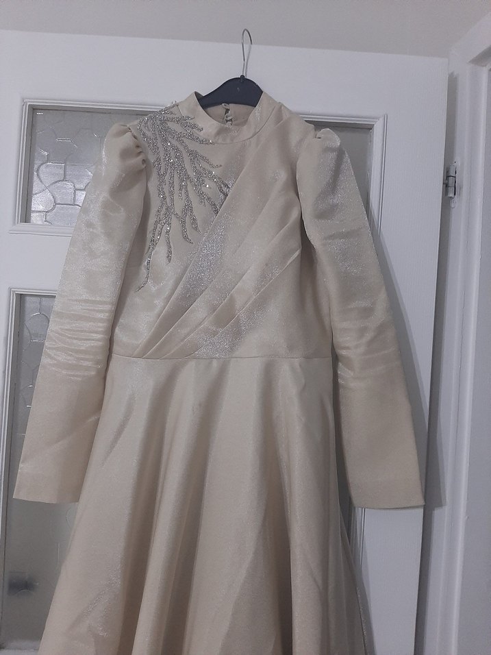 Bej renkli, yüksek yakalı ve uzun kollu abiye elbise. Drapeli tasarım ve gri işlemeli detaylar içerir. Modern klasik tarzda, normal kesim ve gösterişli bir modeldir. simli bir abiye lacrima marka 36 38 uyumlu