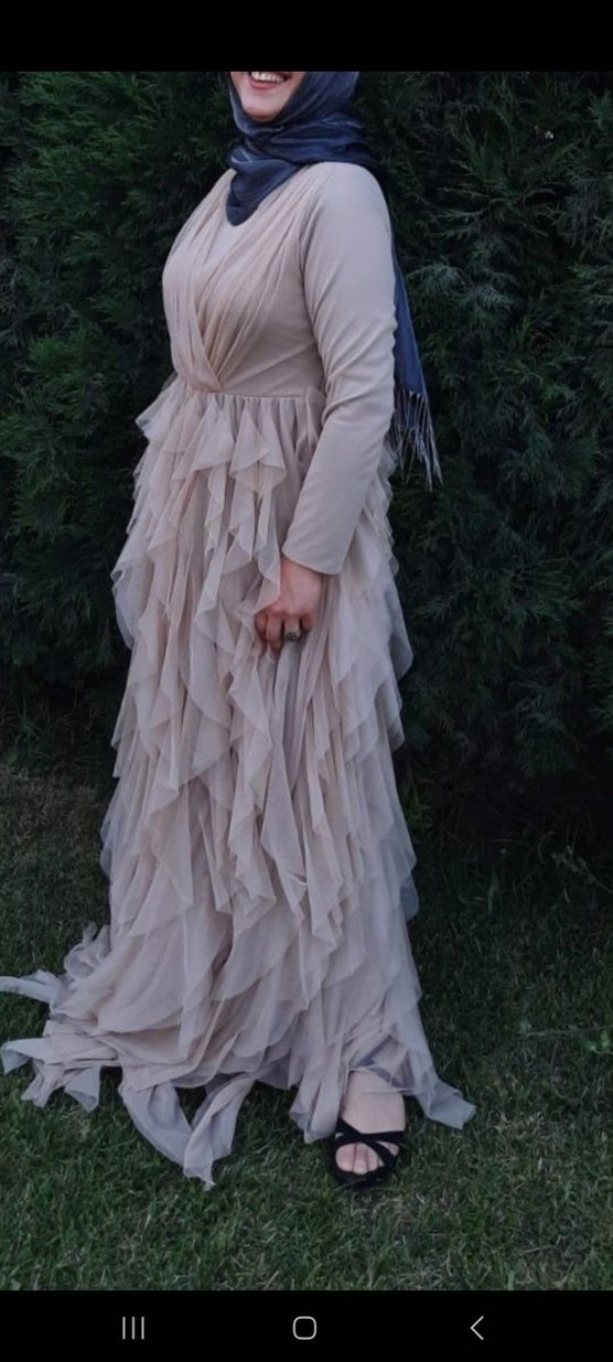 Uzun Kollu Bej Kadın Bohem Abiye Elbise