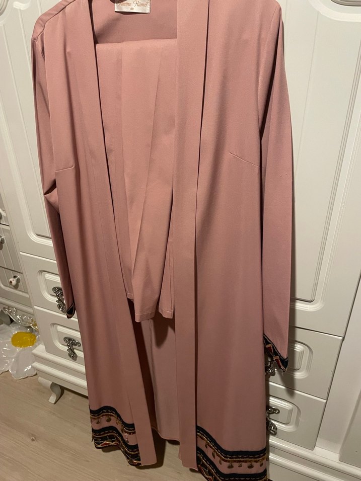 Uzun kollu, şal yakalı, dökümlü ve satenimsi dokuda bej kadın takımı. Modest ve Paris tarzı bohem şıklık sunar, ofis kullanımı için uygundur. Unpatterned ve pastel tonlarda.