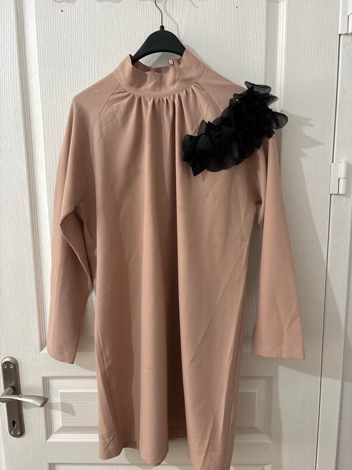 Uzun kollu, yüksek yakalı bej tunik, bir omuzda siyah fırfır detayıyla. Sentetik kumaştan, günlük kullanım için uygun, salaş kesim ve sokak stili etkisiyle.