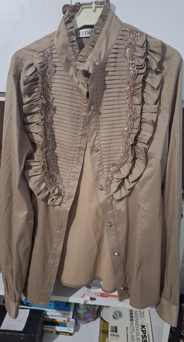 Uzun kollu, bol kesim bej keten gömlek, fırfır ve nakış detaylarıyla. Yaka tipi gömlek yakalı, bohem Paris tarzında, ofis için uygun. (Alvina markalı ürünlerin toplu satışında abiye çantayı ücretsiz vereceğim, uyumlu olduğundan)
