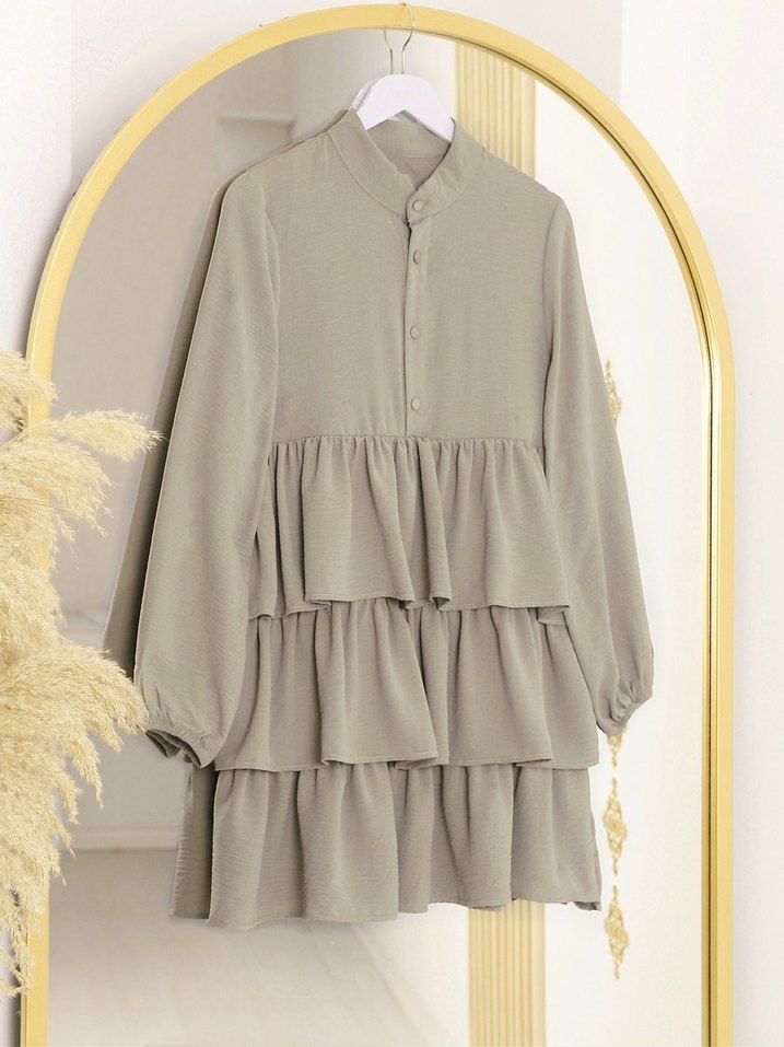 Uzun Kollu Bej Keten Fırfırlı Tunik