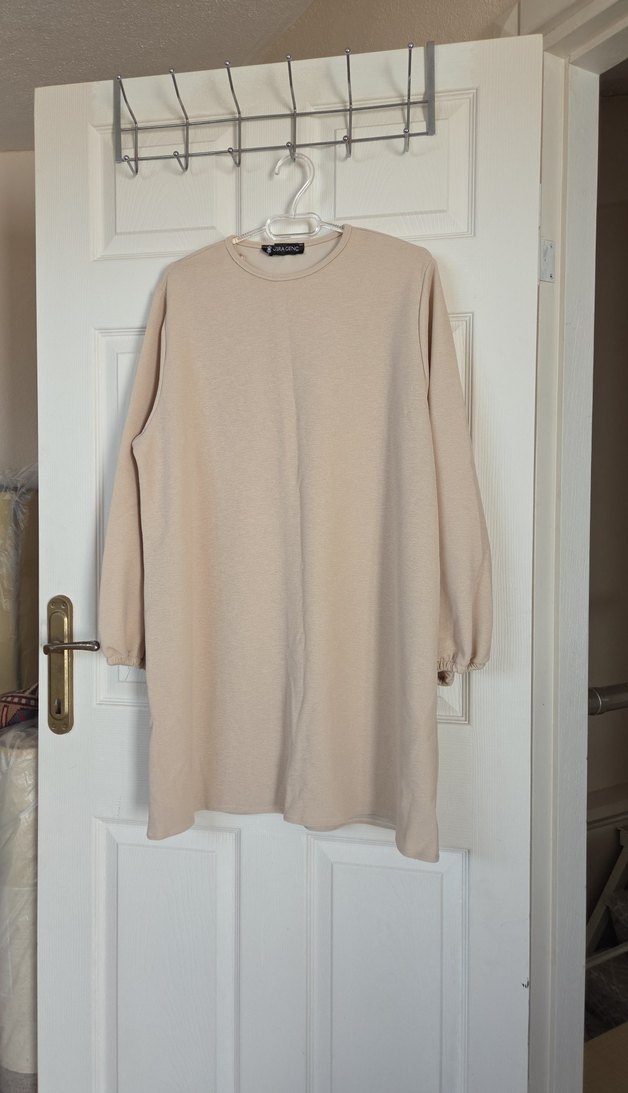 Uzun kollu, bisiklet yaka ve keten kumaştan yapılmış bej tunik. Salaş kesimi ve uzun boyu ile rahat ve sade bir görünüm sunar.