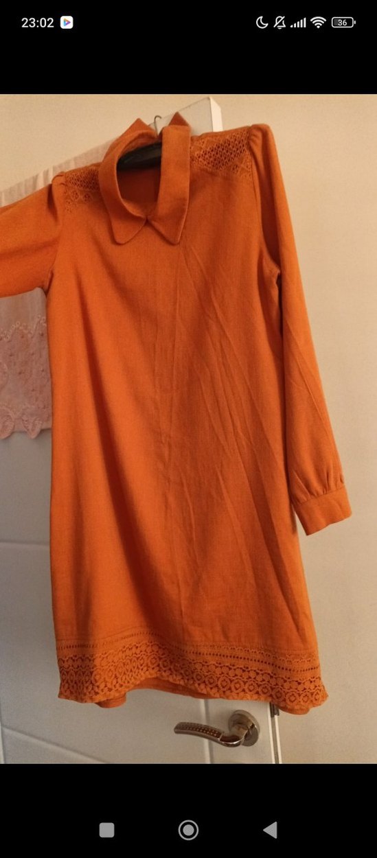 Keten kumaştan, uzun kollu ve yakalı, düğmeli bol kesim midi tunik. Etek kısmında ince dantel detayları bulunur. Günlük kullanıma uygun bohem tarzda.