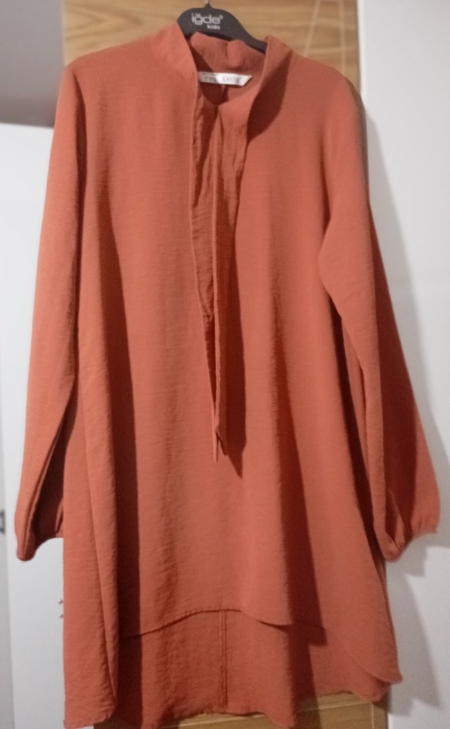 Uzun kollu, yüksek yakalı bej keten tunik. Bol kesim ve dökümlü yapısıyla günlük kullanıma uygun minimal bohem tarzda. 1 defa tek giyildi
