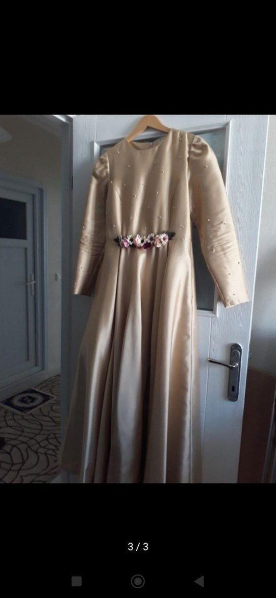 Bej renkte, uzun kollu ve nakışlı vintage tarzda abiye elbise. Drapeli tasarımı ve yakasında çentikli yaka detayı bulunur. Belde çiçekli kemer vardır.