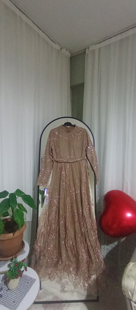Uzun Kollu Bej Parlak Kadın Abiye Elbise