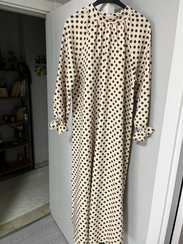 Bej renkte, koyu puantiyeli, uzun kollu ve yüksek yakalı uzun, bol kesim ve günlük kullanım için uygundur