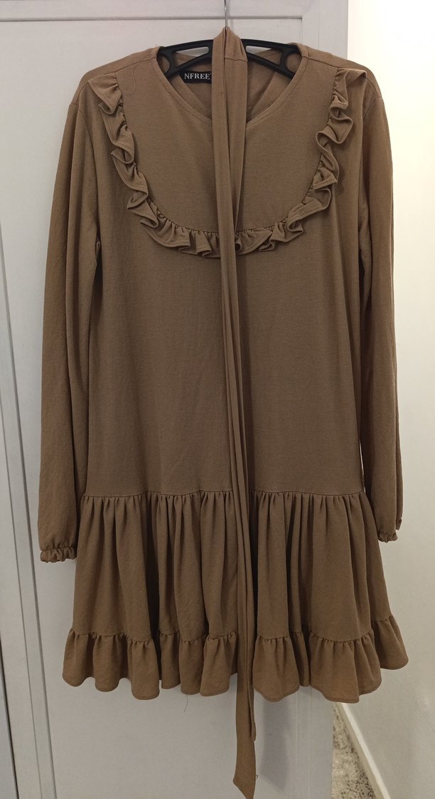 Uzun kollu, bej renkli, bol kesim triko elbise. Yaka ve etek ucunda fırfır detayları bulunur. Yumuşak keten kumaştan, rahat ve bohem tarzda. 38 beden sorunsuz tunik