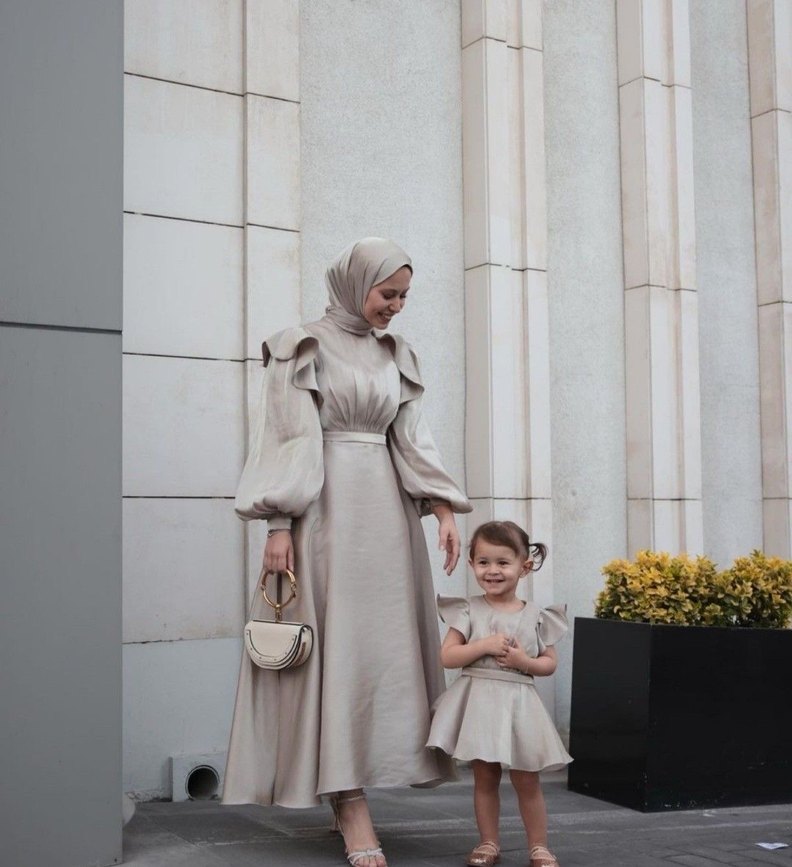 Uzun Kollu Bej Saten Tesettü Elbise Anne kız takım