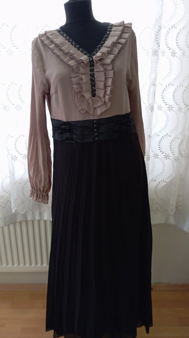 Uzun Kollu Bej Siyah Pilili Elbise