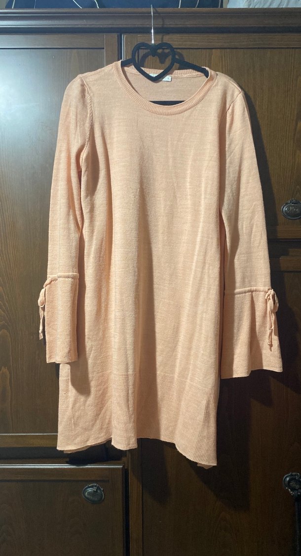Yumuşak keten kumaştan, uzun kollu ve bisiklet yaka, pastel bej renkte bol kesim triko elbise. Günlük kullanıma uygun rahat ve konforlu.