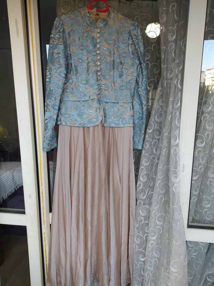 Uzun kollu, bej pilili etek ve gri nakışlı, klasik kesim yakalı vintage kadın elbisesi, düğünler için uygundur.