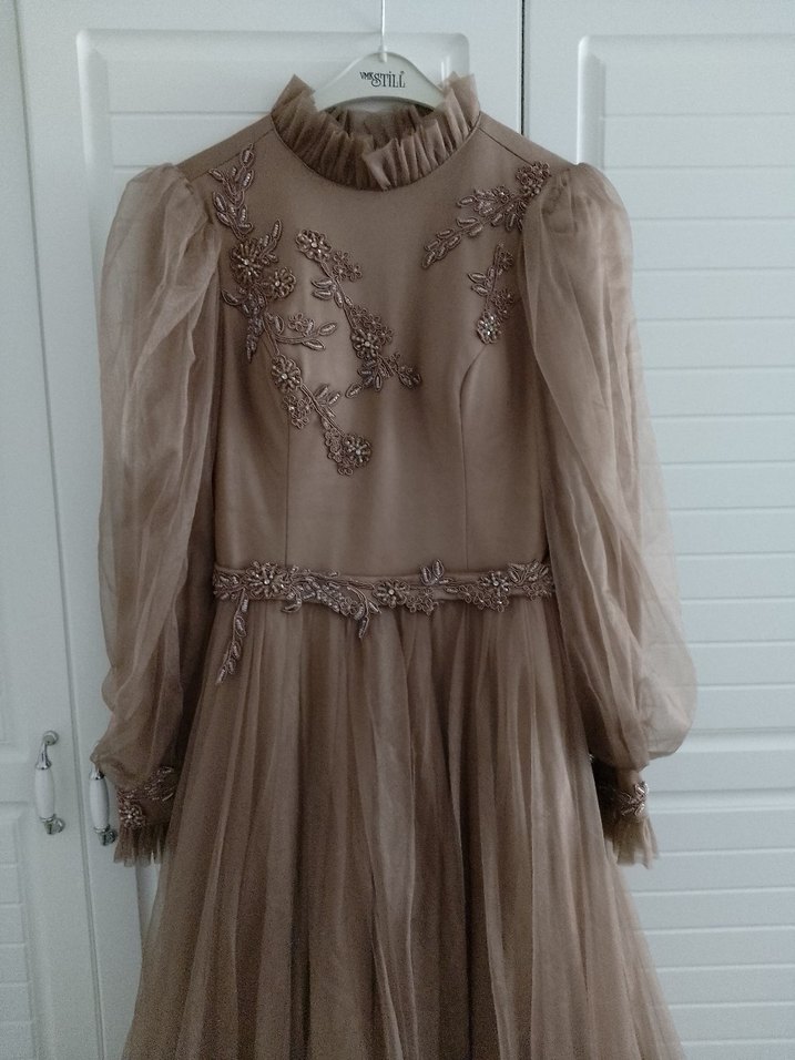 Bej renkli, yüksek yakalı ve uzun kollu bu uzun abiye elbise, nakış işlemeleri ve drapeli detaylarıyla gevşek kesime sahiptir.