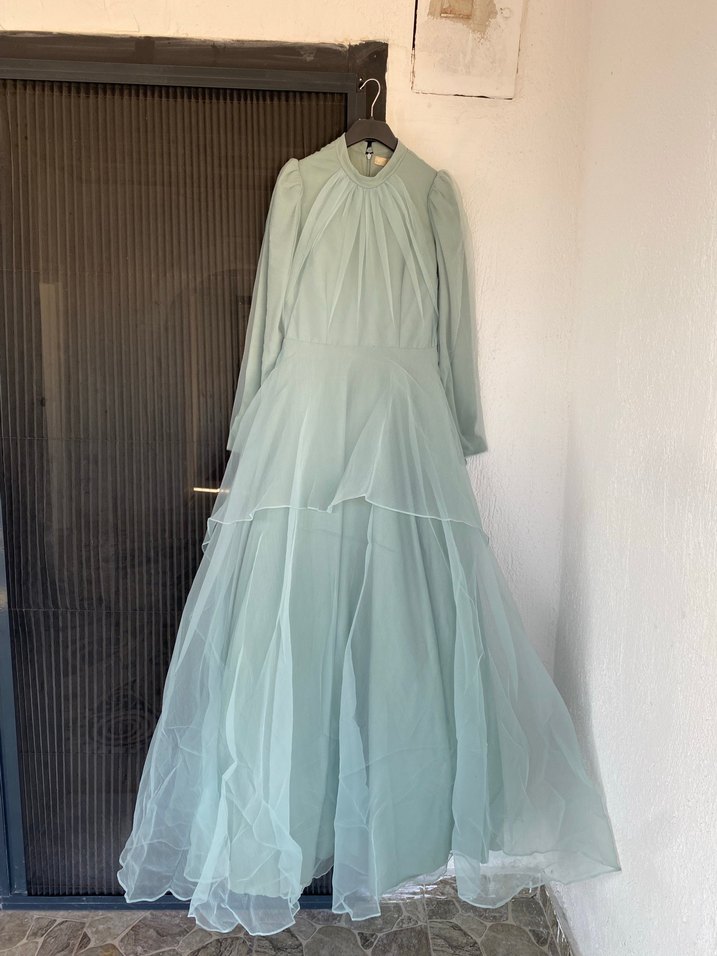 Yüksek yakalı, uzun kollu ve bol kesimli bej vintage kadın abiye elbise, drapeli katmanlarla düğünler için uygundur. Üründe kusurlar mevcuttur ve görselde ekledim