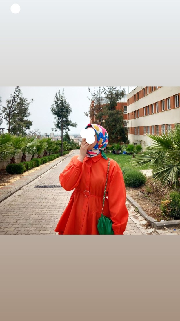Yüksek yakalı, uzun kollu kadın gömlek . Turuncu renk sentetik kumaştan. Günlük kullanıma uygun, tesettüre uygun gömlek.
