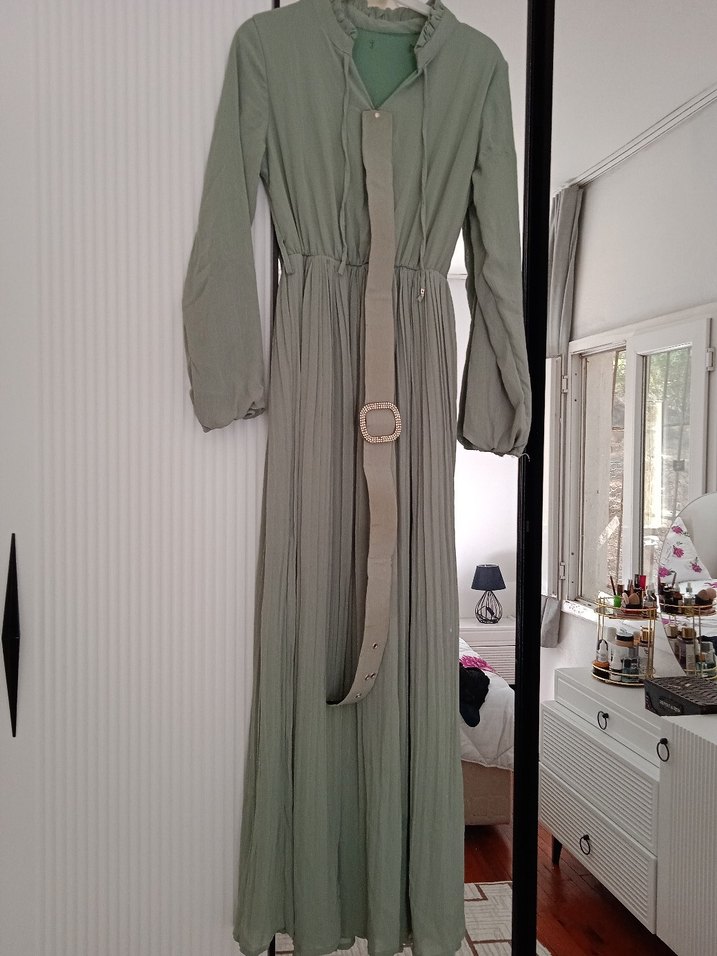 Yüksek yakalı, uzun kollu, belden kemerli uzun boy elbise. Yumuşak sentetik kumaştan, rahat kesim, günlük sokak giyimi için uygundur. üründe küçük bir deforme var her ikisinide çektim fotoğraflarda görünüyor.