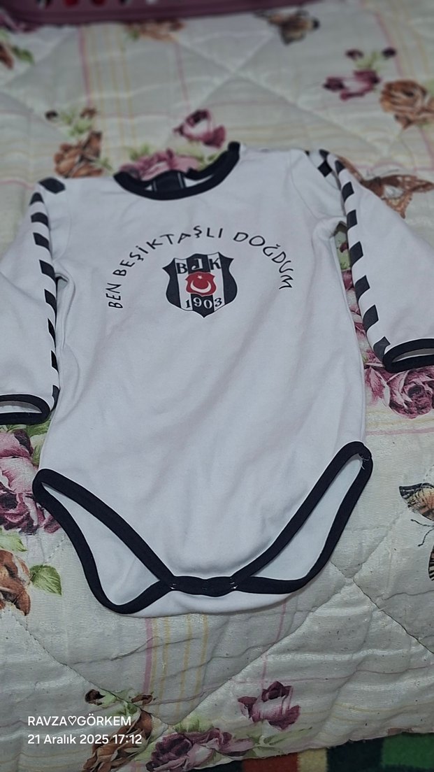 Pamuklu beyaz uzun kollu bebek body, Beşiktaş baskılı ve koyu renk detaylı. Yuvarlak yaka ve kolay giydirme için çıtçıtlıdır. az kullanıldı temiz sorunsuz sıfır gibi marka üründür.