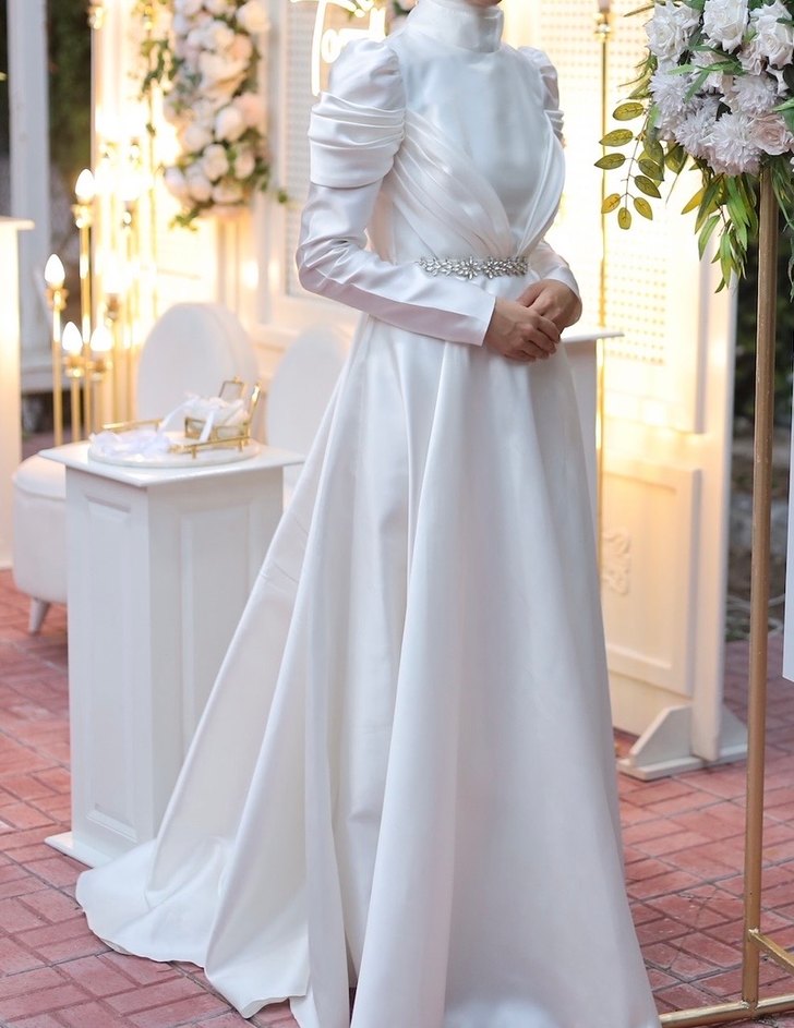 Yüksek yakalı ve uzun kollu, klasik A kesim beyaz nişan elbisesi. Belinde taşlı kemer detayı bulunmaktadır. Nişanımda bir kere giydim leke vs bulunmamaktadır.Zühre tesettür giyim mağazasından 7 bin TL’ye almıştım satmak istiyorum.