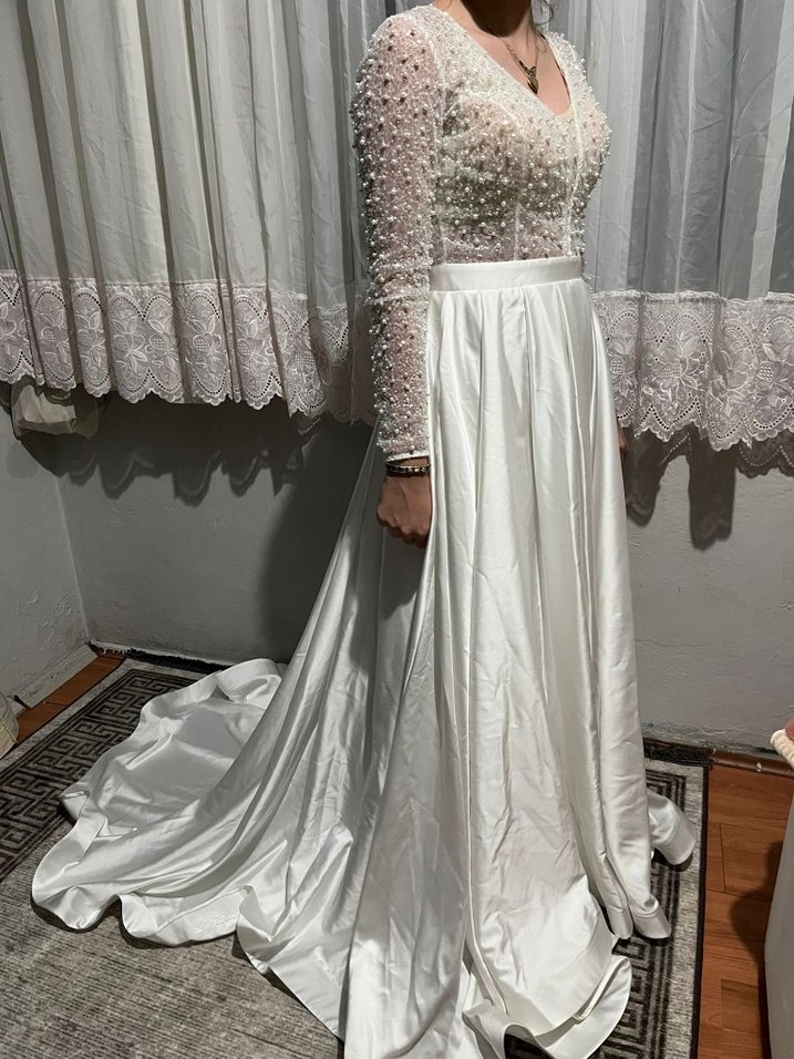 Uzun kollu, V yakalı, inci detaylı uzun beyaz A-line gelinlik. Parlak kumaşıyla modern klasik ve şık bir görünüm sunar.
